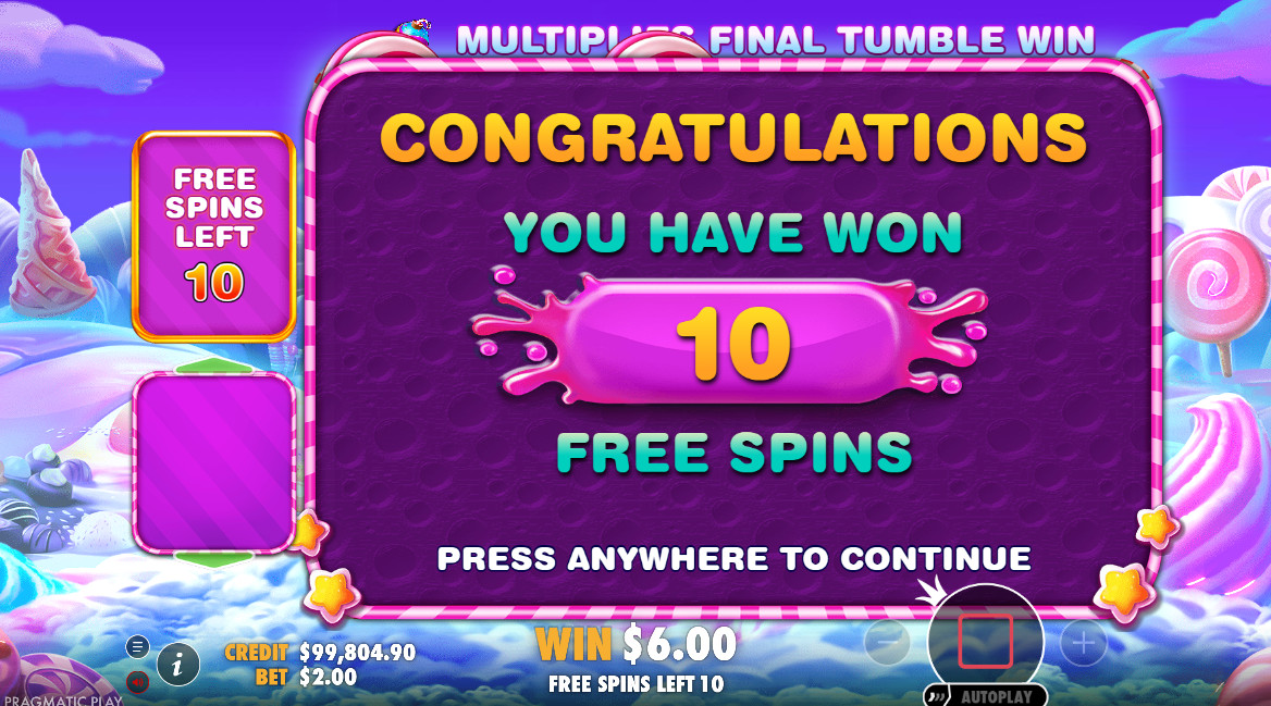 Mūsų bandymų metu nemokamų sukimų raundas buvo aktyvuojamas, kai pasirodydavo bent keturi „Lollipop scatters“ bet kurioje tinklelio vietoje. Ši funkcija suteikia 10 nemokamų sukimų, o papildomi „scatters“ simboliai gali ją vėl aktyvuoti ir pridėti dar daugiau sukimų.