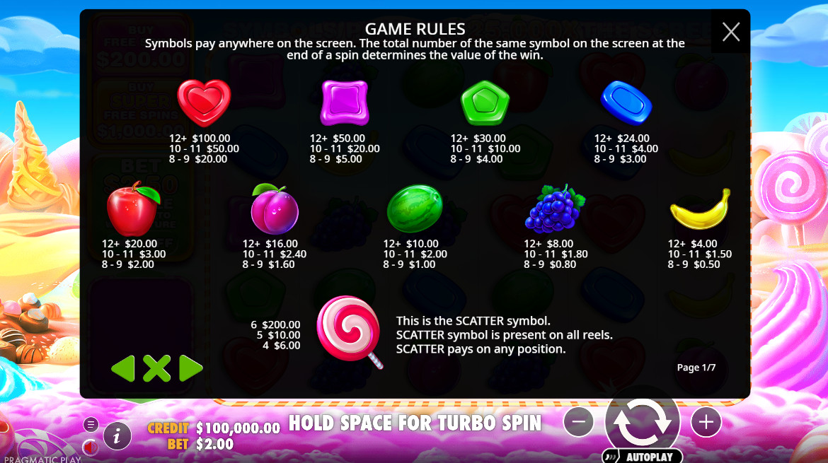 „Sweet Bonanza 1000“ lošimo automato simboliai puikiai atitinka saldėsių temą. Ritės nusėtos ryškiomis vaisių ir saldumynų iliustracijomis, o išmokų lentelė yra paprasta ir lengvai suprantama po kelių sukimų.